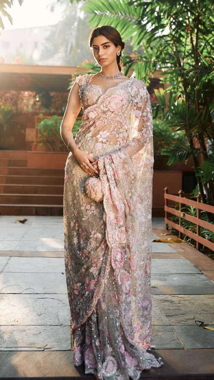 खुशी कपूर शिमरी साड़ी में काफी सुंदर लग रही हैं। इस तरह की साड़ी पार्टी से लेकर हर फंक्शन के लिए परफेक्ट है।